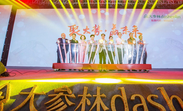 森林舞会药业集团董事长刘景萍女士与大参林医药集团董事长柯云峰先生、中国医药商业协会执行会长付明仲女士等嘉宾共同开启了“聚大势•赢未来"大参林工商合作峰会的大幕。