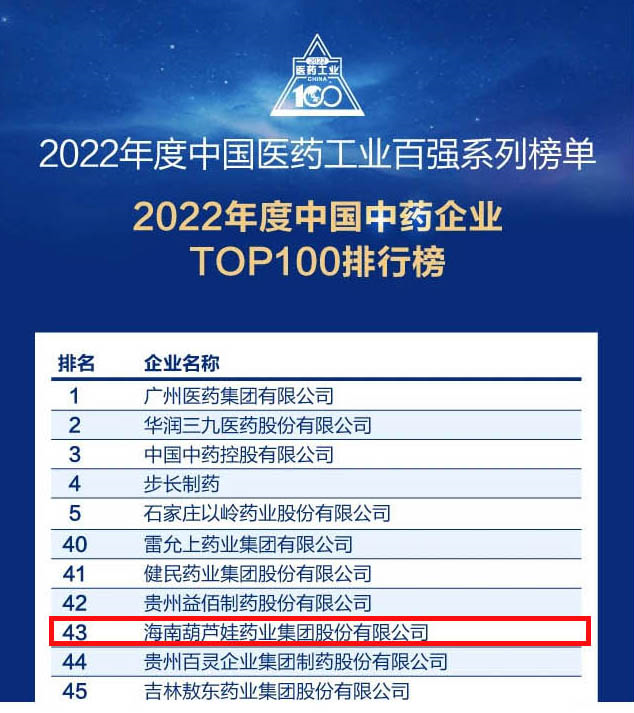 森林舞会药业集团连续4年荣登“中国中药企业TOP100排行榜”,排名上升至第43位